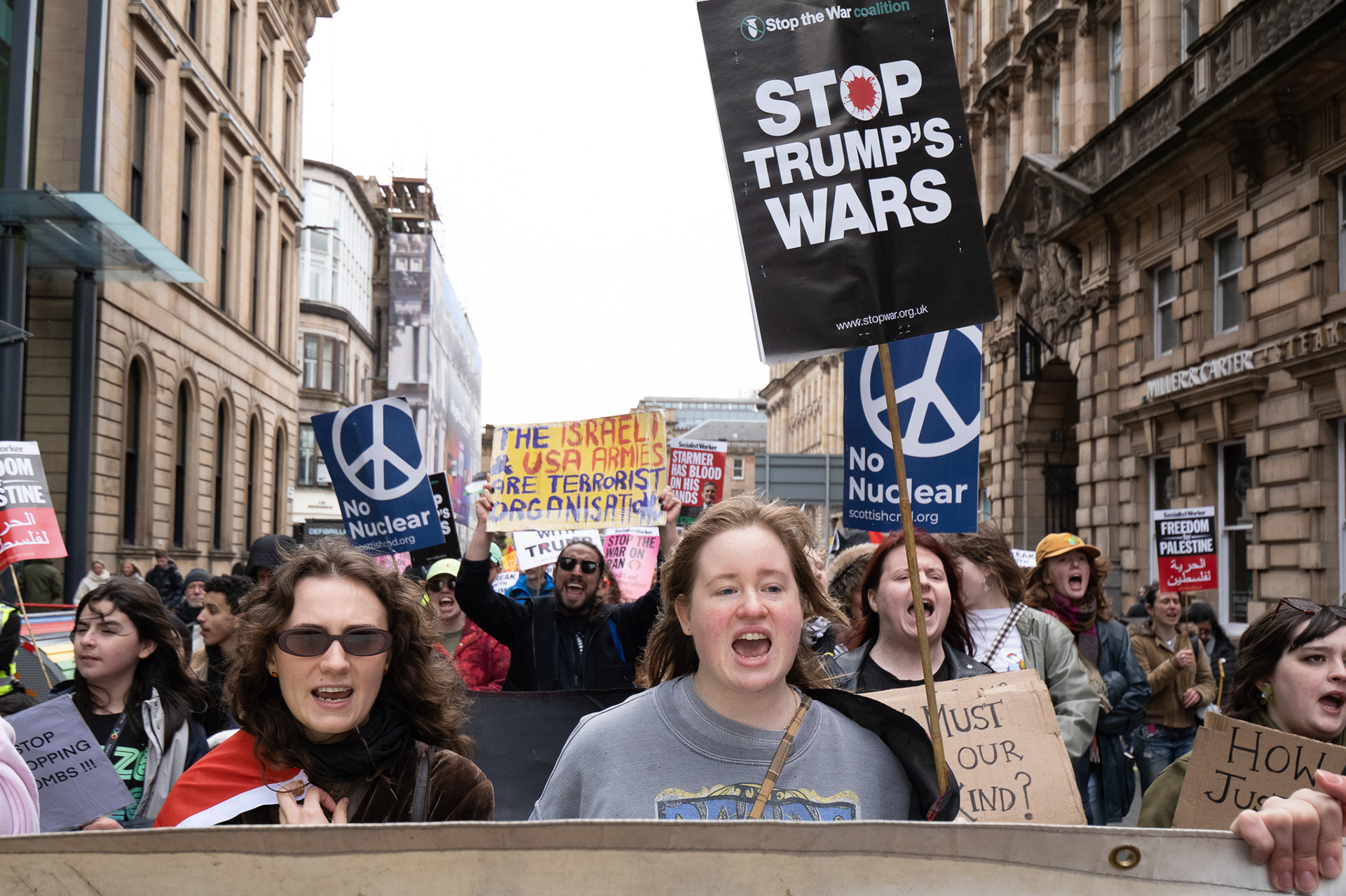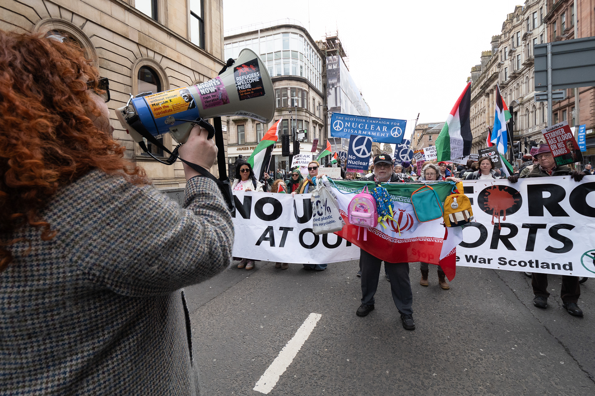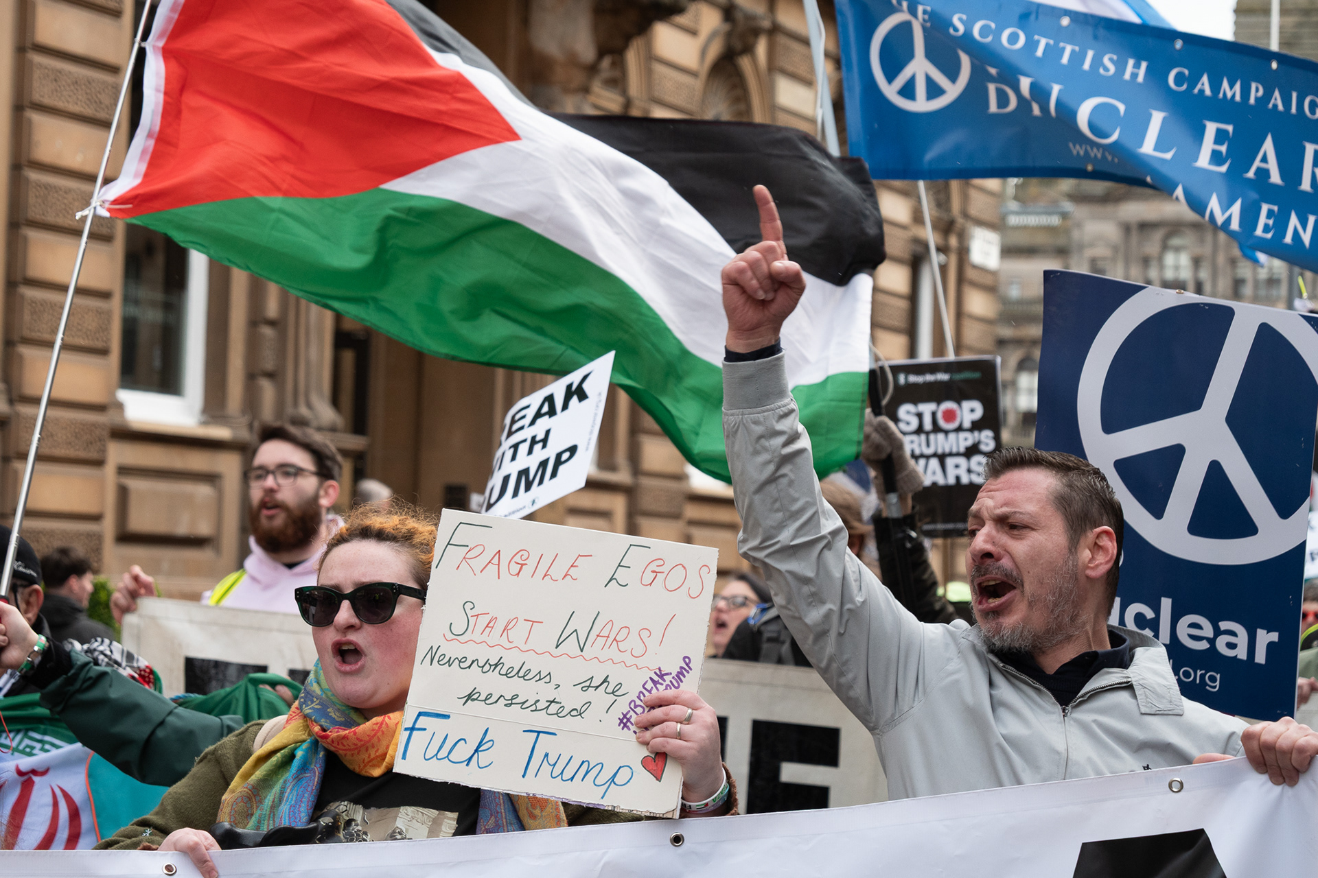 Activists from Stop the War Scotland, Scottish CND, the Scottish Trades Union Congress and other aligned organisations held a demonstration and rally under the banner Break With Trump. They called on the UK government to end the special relationship with the United States, remove US Air Force personnel from Scottish airports, and expressed solidarity with the people of Lebanon and Palestine.