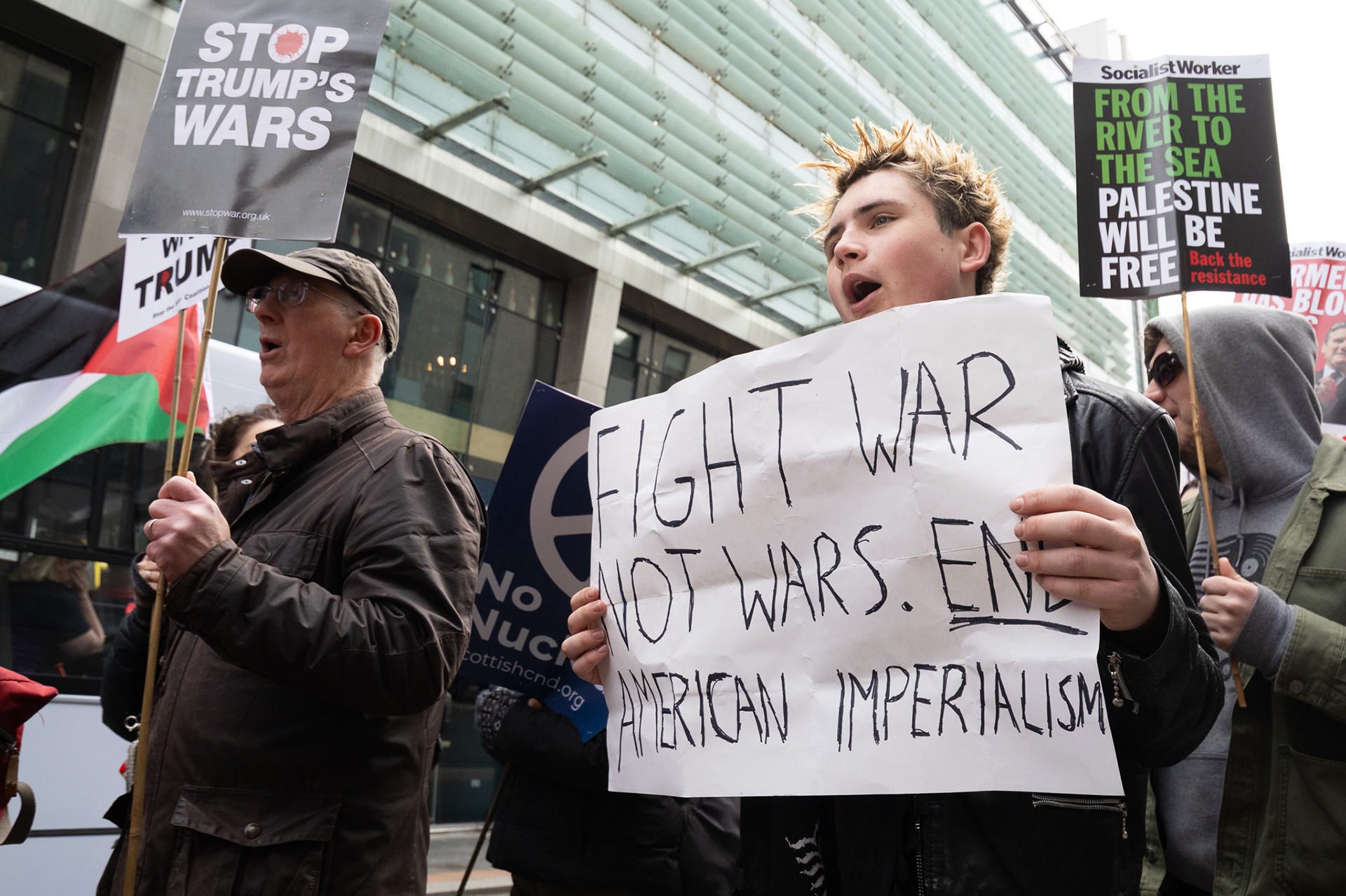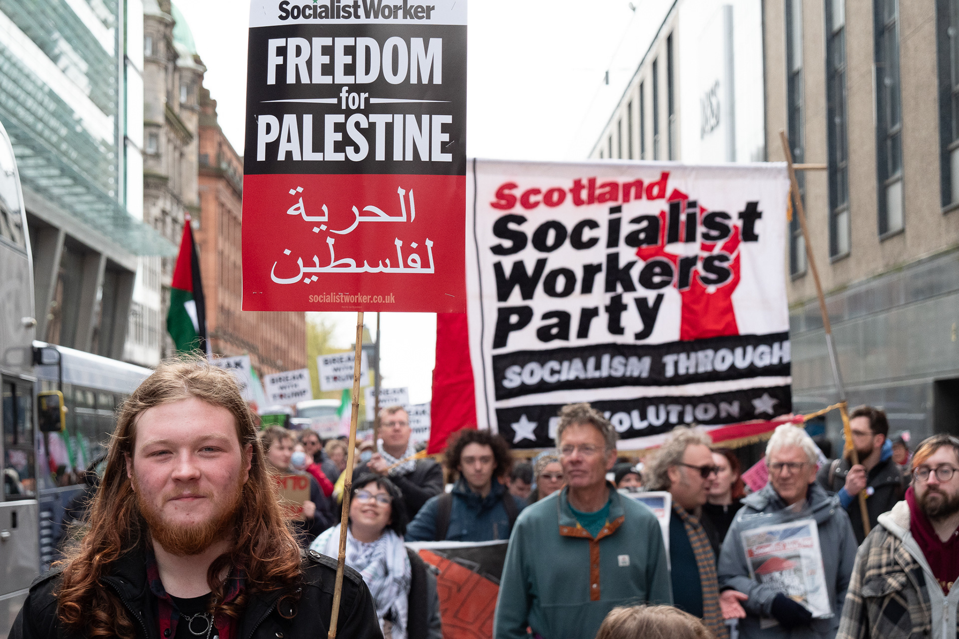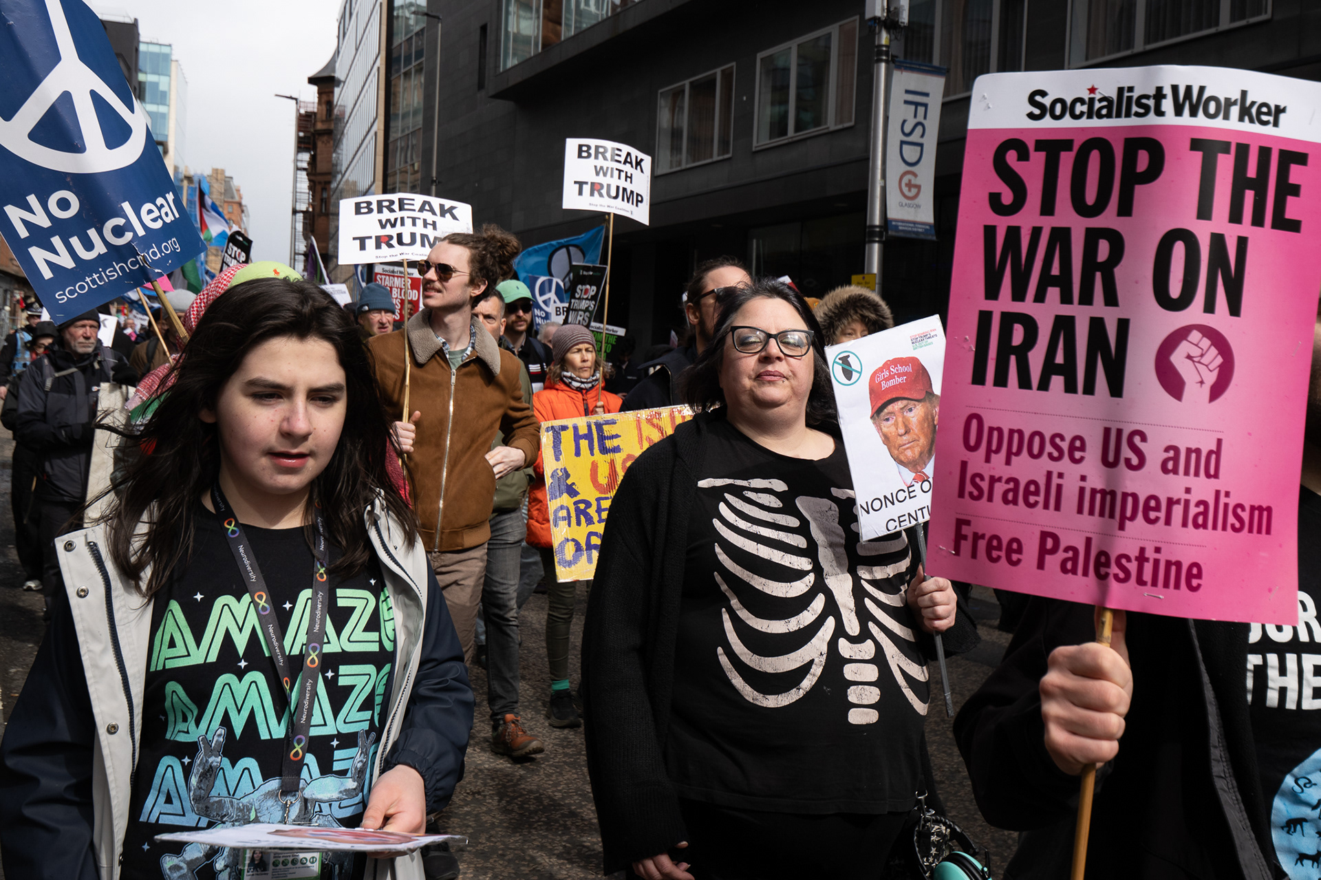Activists from Stop the War Scotland, Scottish CND, the Scottish Trades Union Congress and other aligned organisations held a demonstration and rally under the banner Break With Trump. They called on the UK government to end the special relationship with the United States, remove US Air Force personnel from Scottish airports, and expressed solidarity with the people of Lebanon and Palestine.