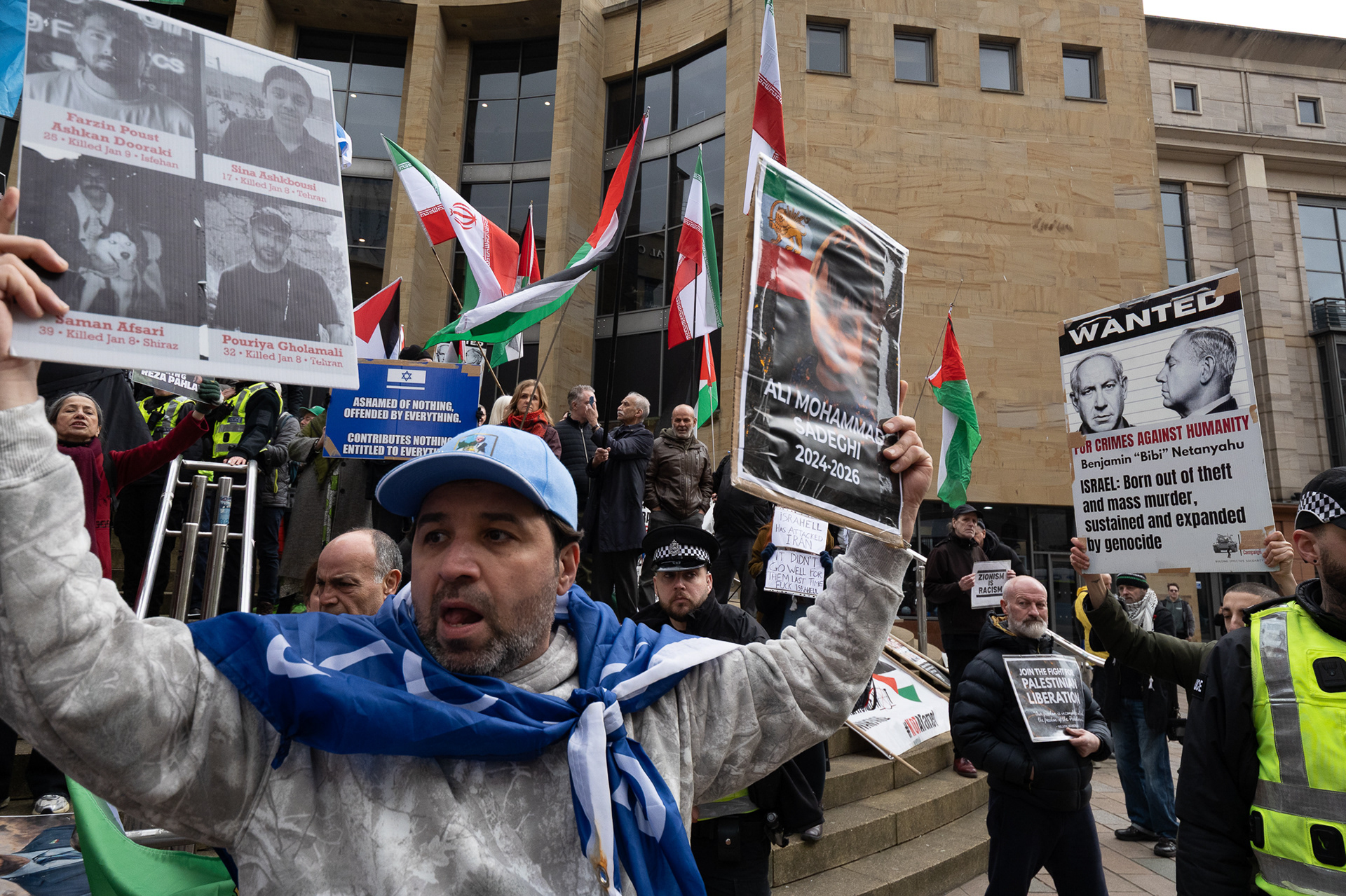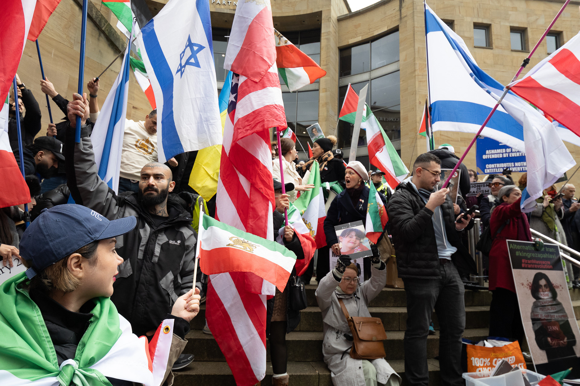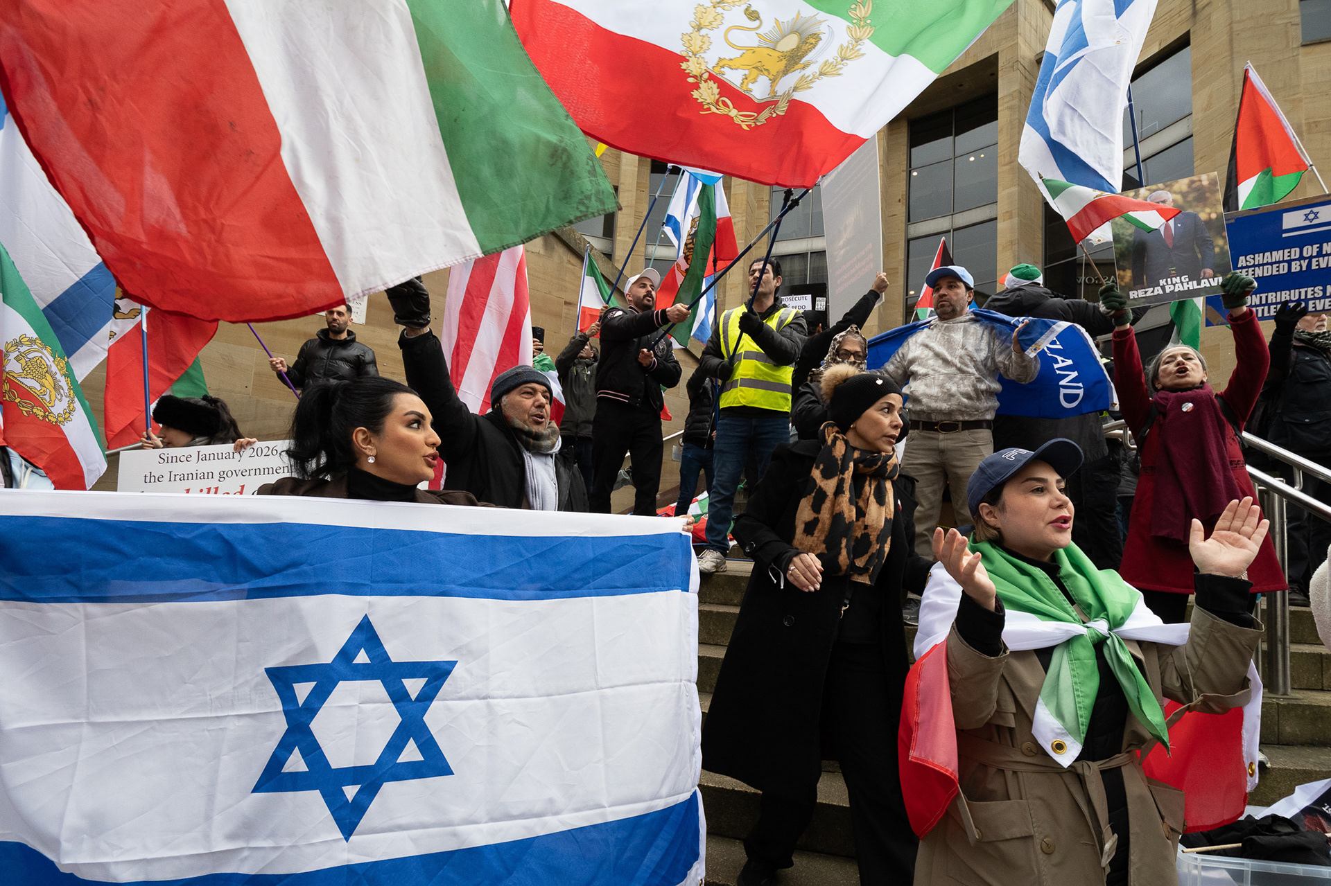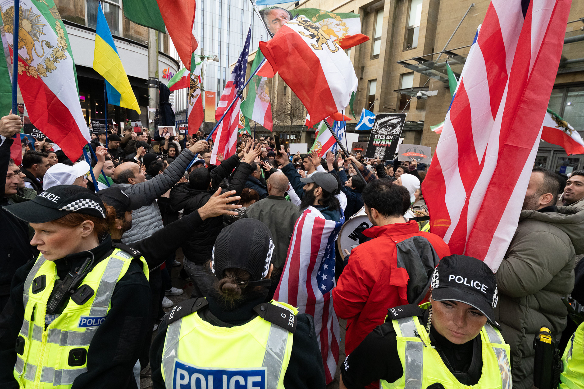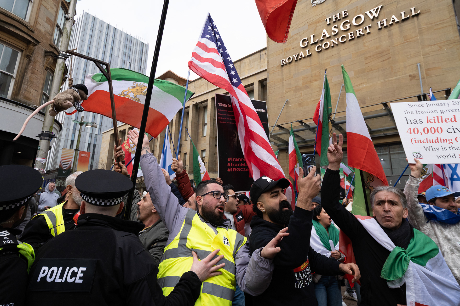 28th Feb 2026 - Members of Scotlands Iranian community, who in recent weeks have been calling for support from the United States and Israel for regime change, held a demonstration in Glasgow as hundreds gathered following news of recent attacks on Iran. The protest was met by a counter-demonstration from pro-Palestinian activists opposing U.S. and Israeli actions.