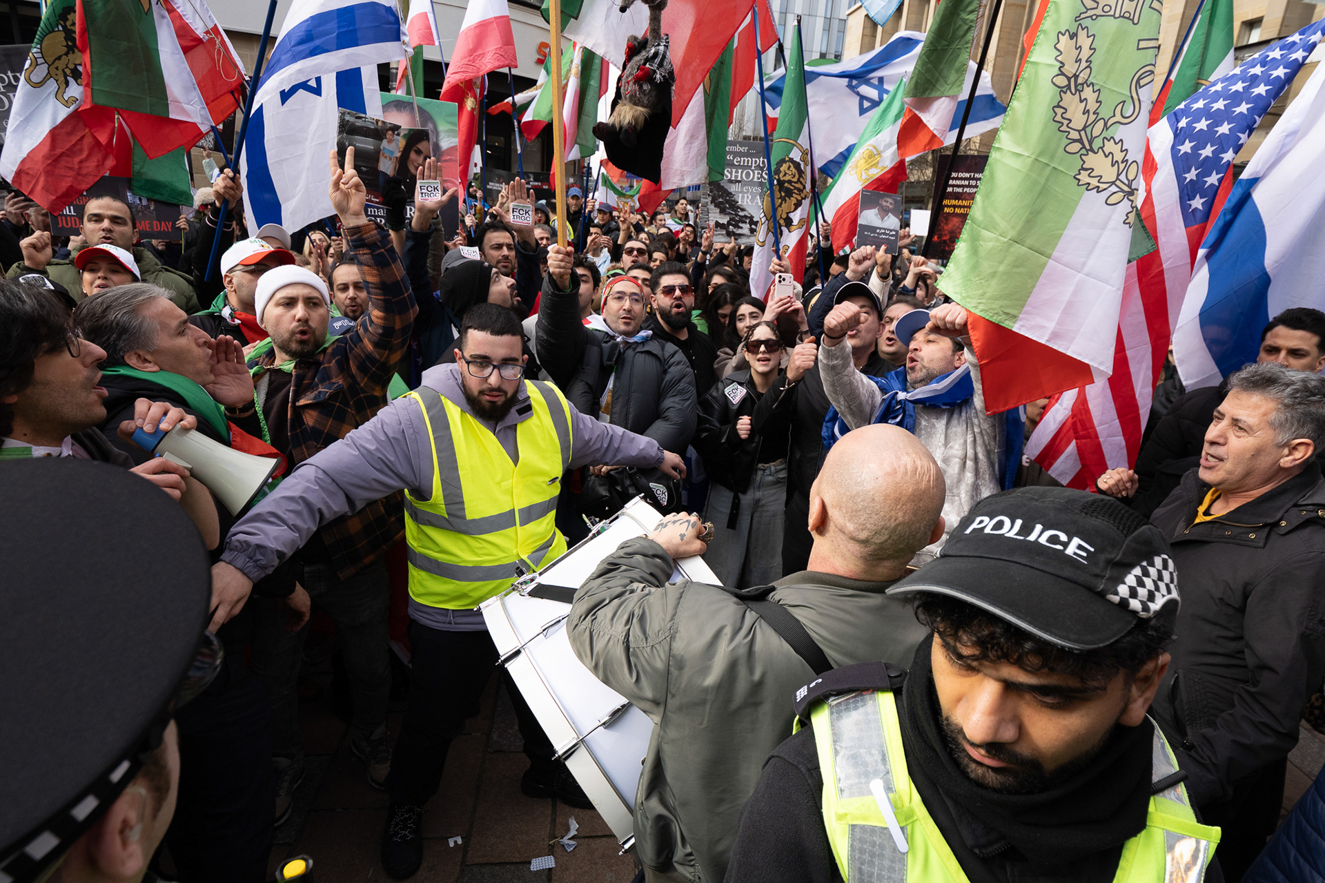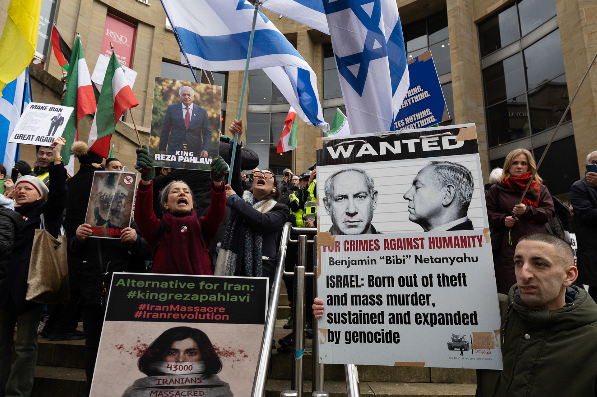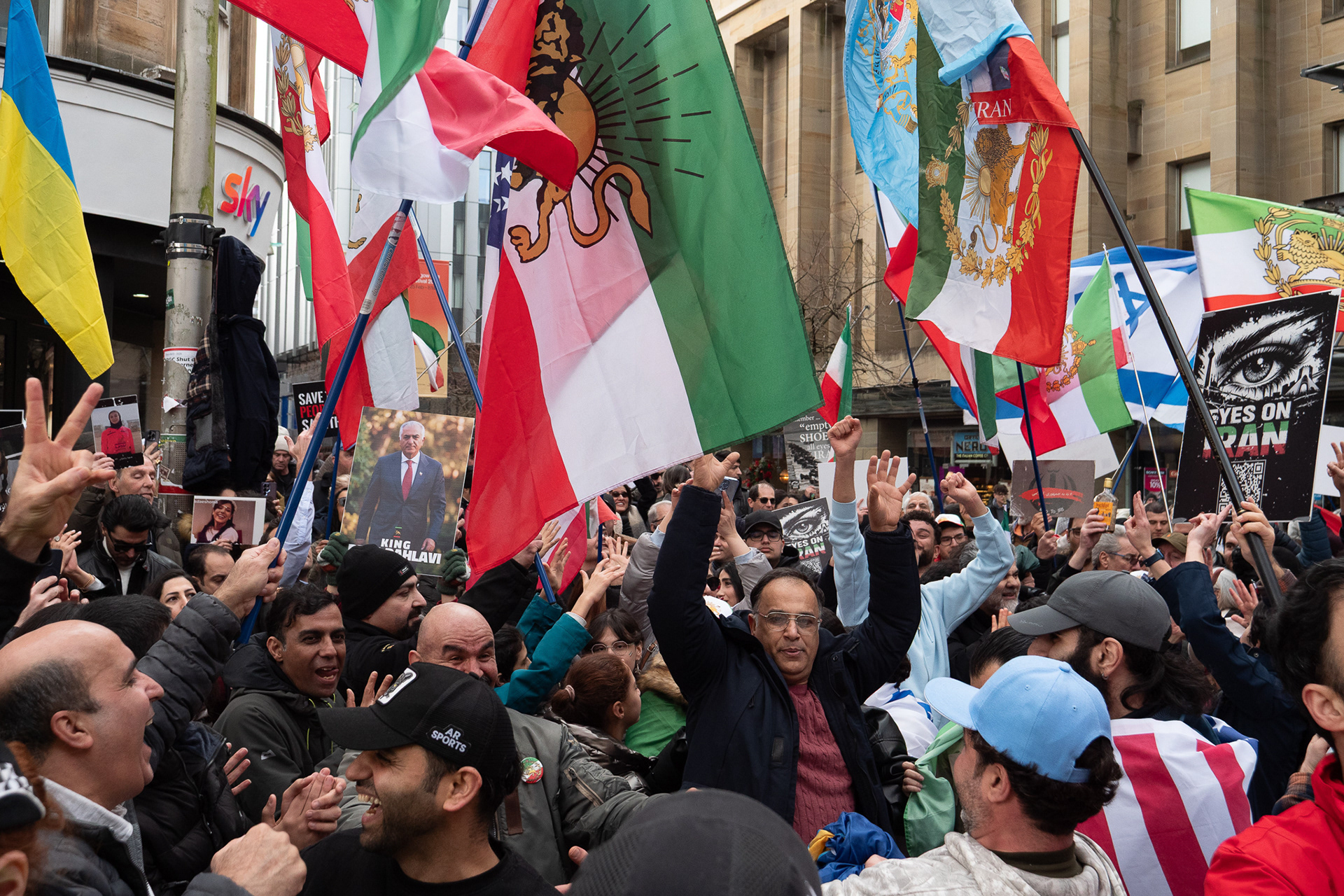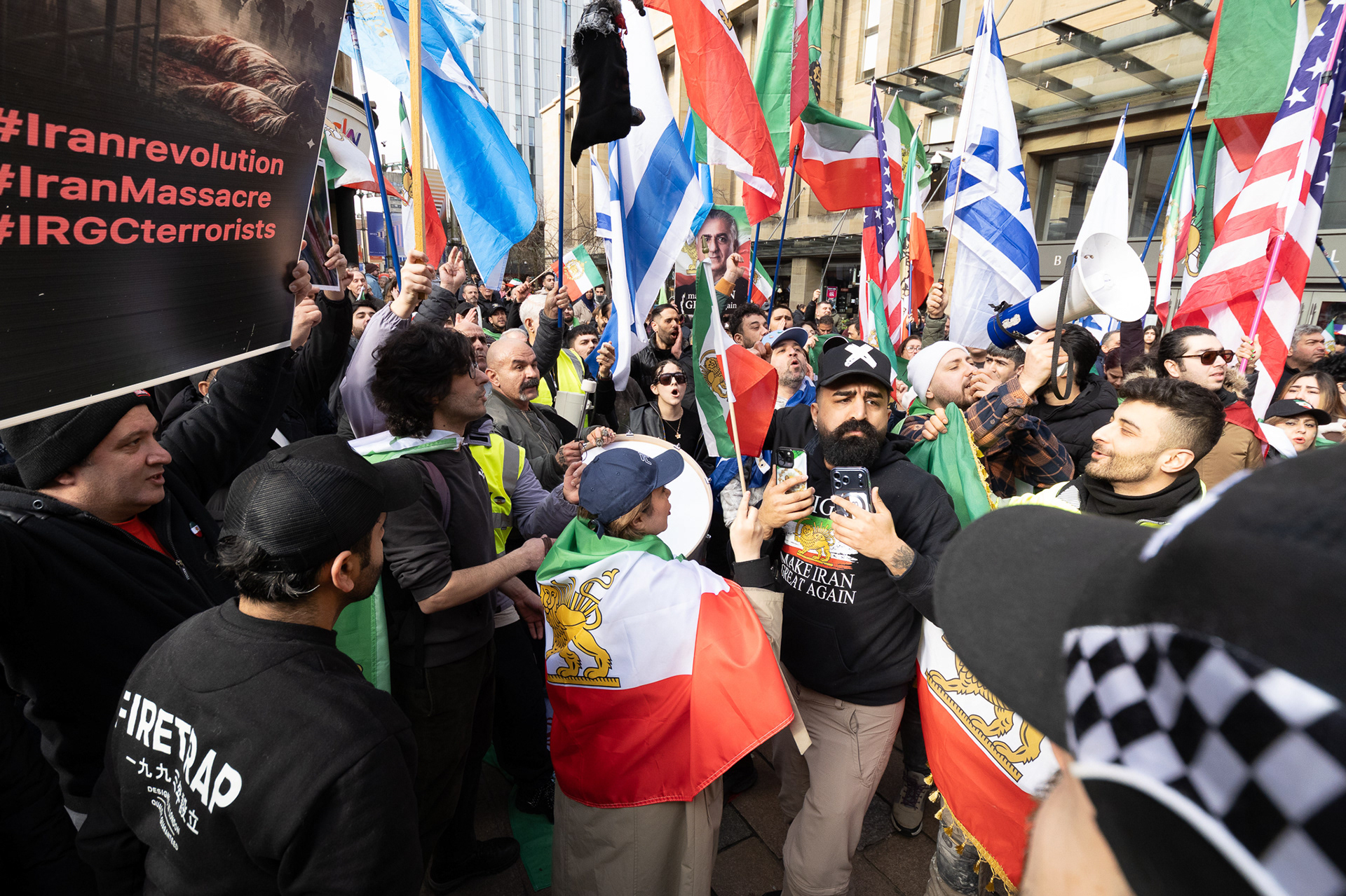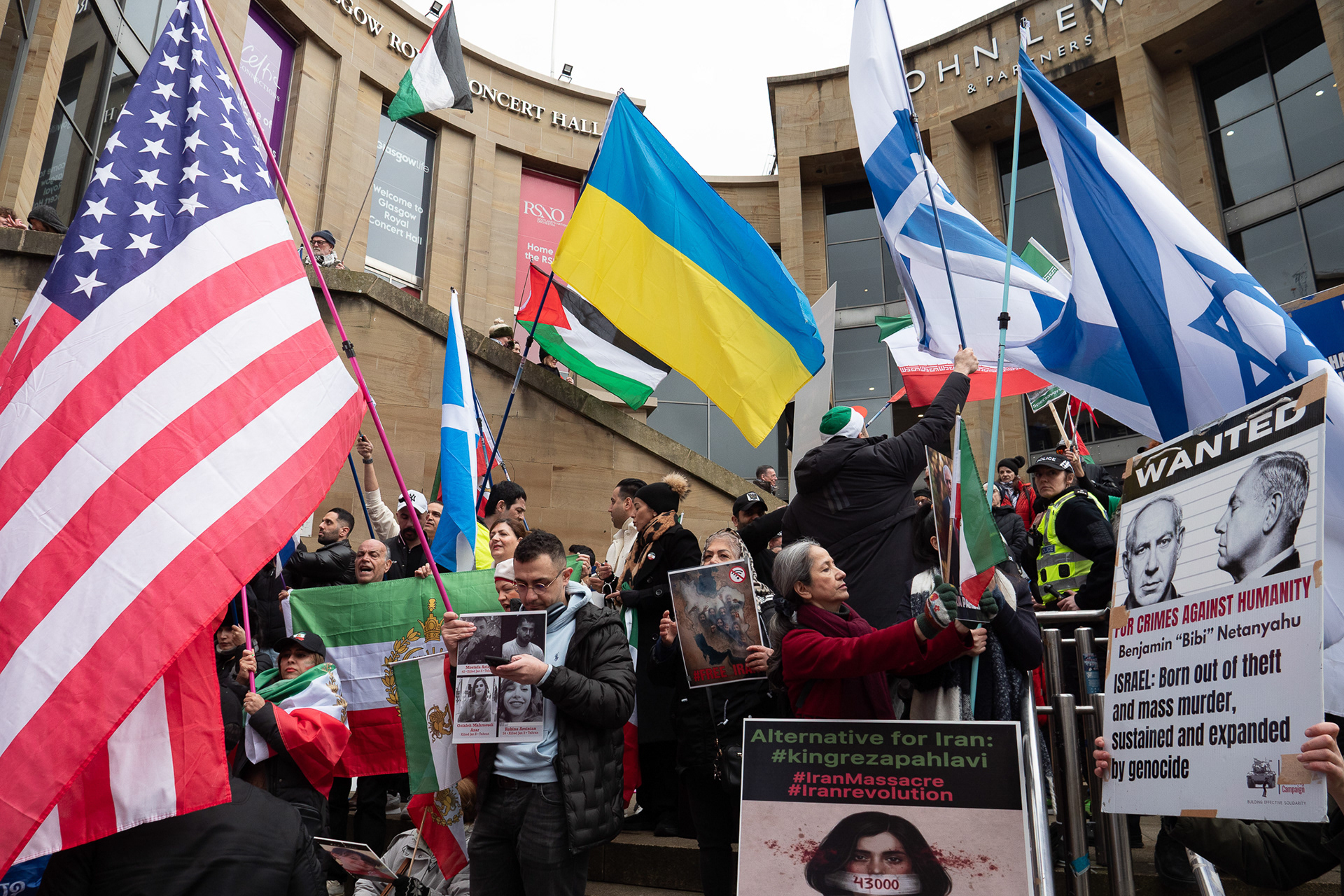 28th Feb 2026 - Members of Scotlands Iranian community, who in recent weeks have been calling for support from the United States and Israel for regime change, held a demonstration in Glasgow as hundreds gathered following news of recent attacks on Iran. The protest was met by a counter-demonstration from pro-Palestinian activists opposing U.S. and Israeli actions.