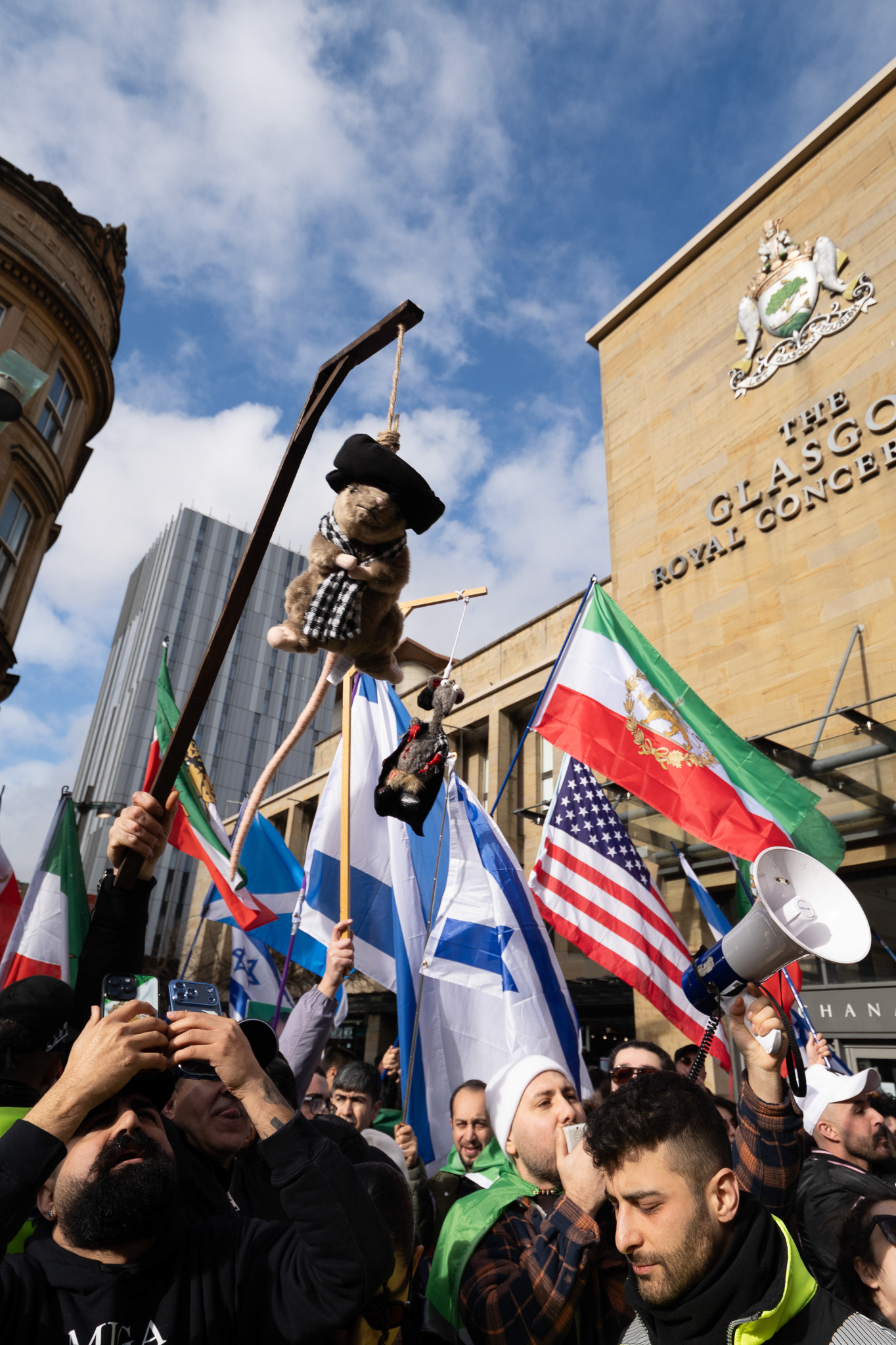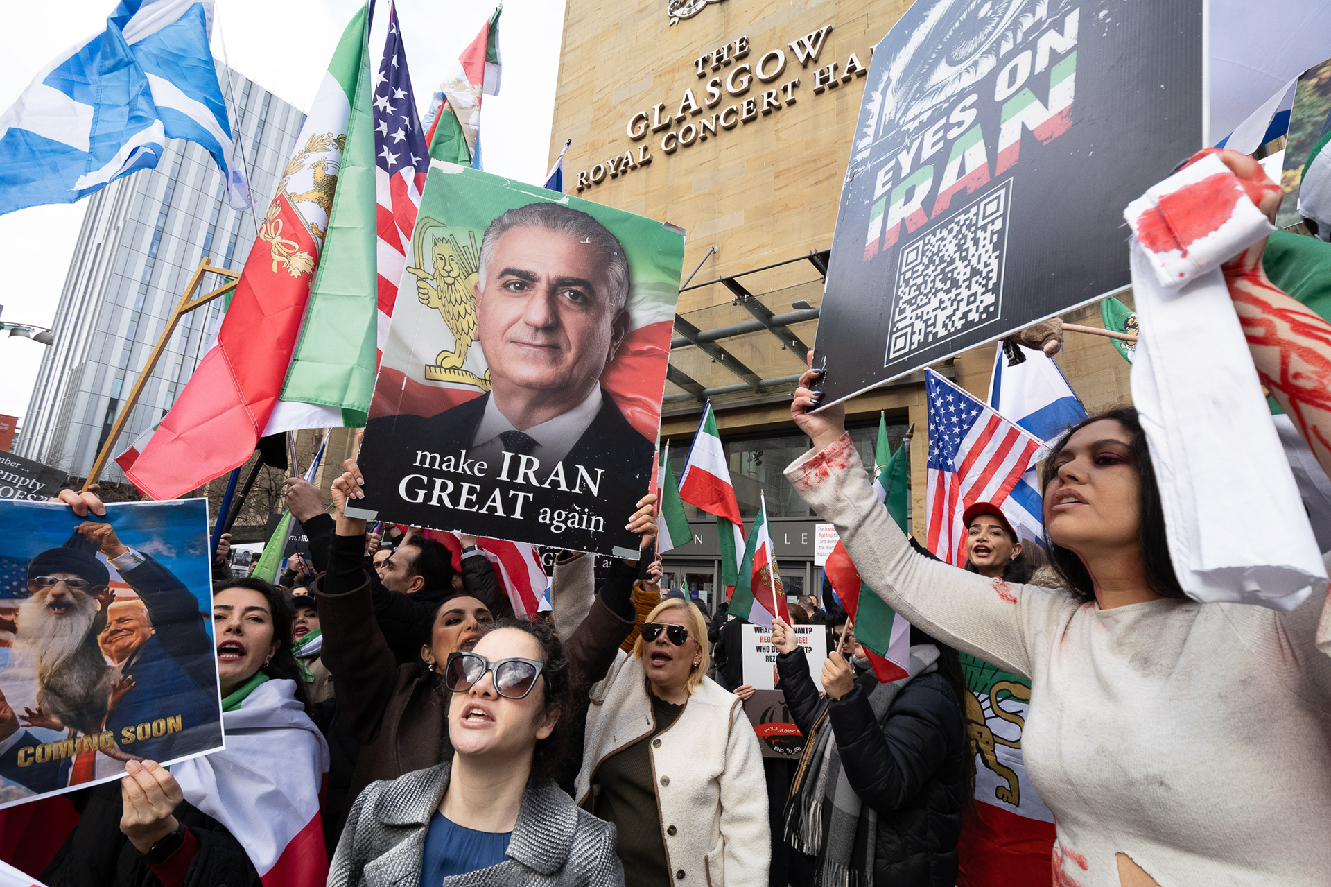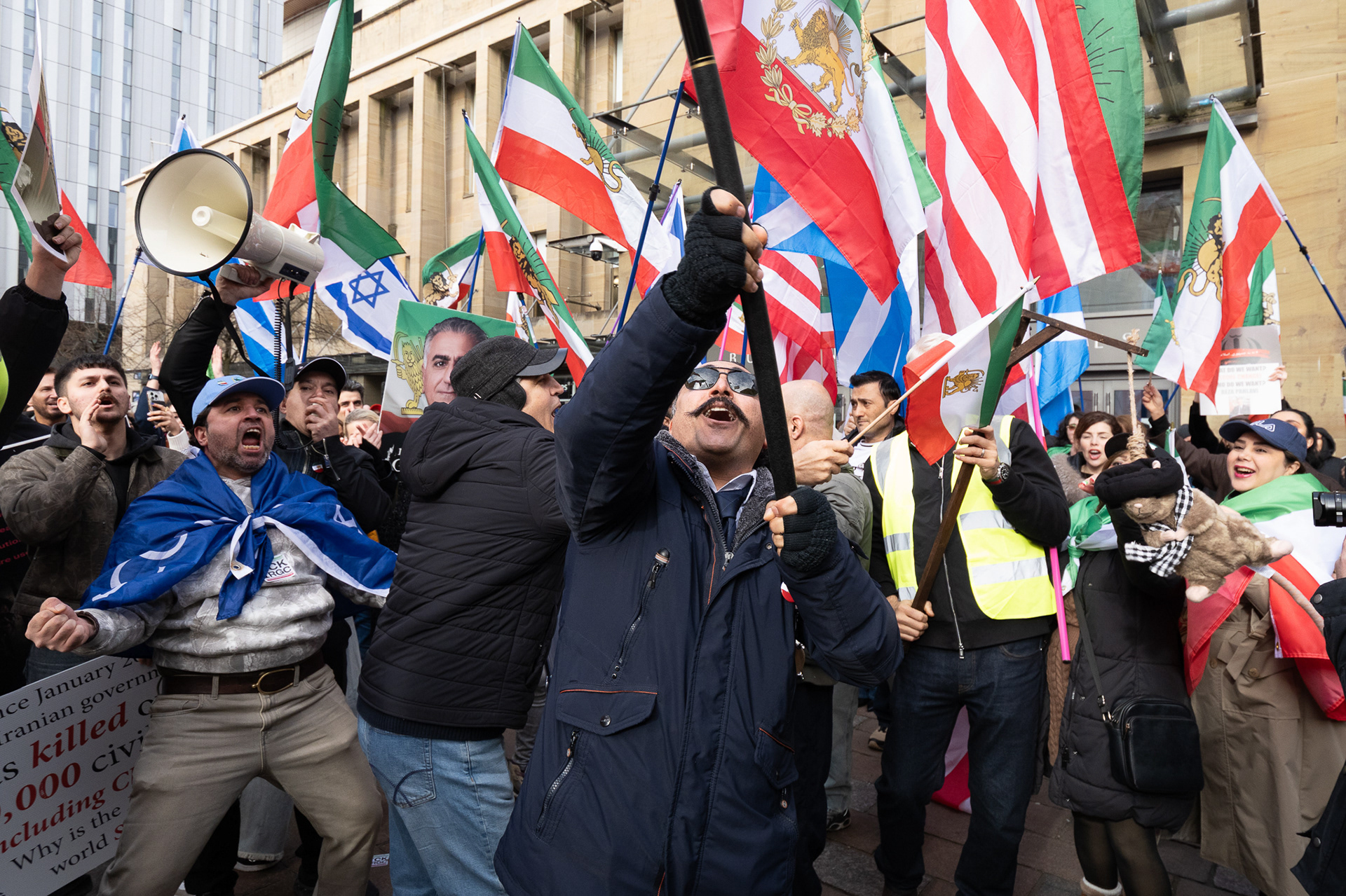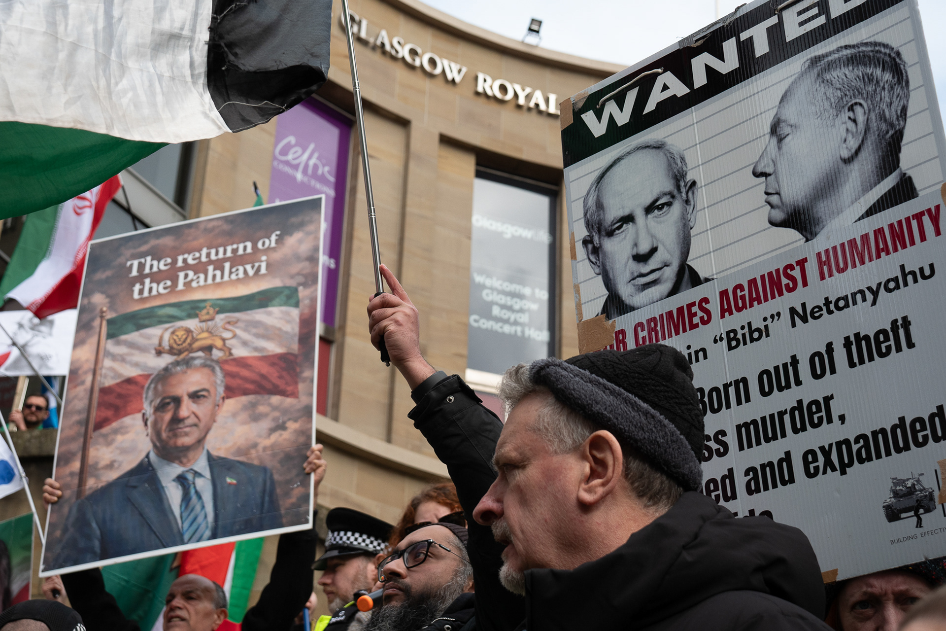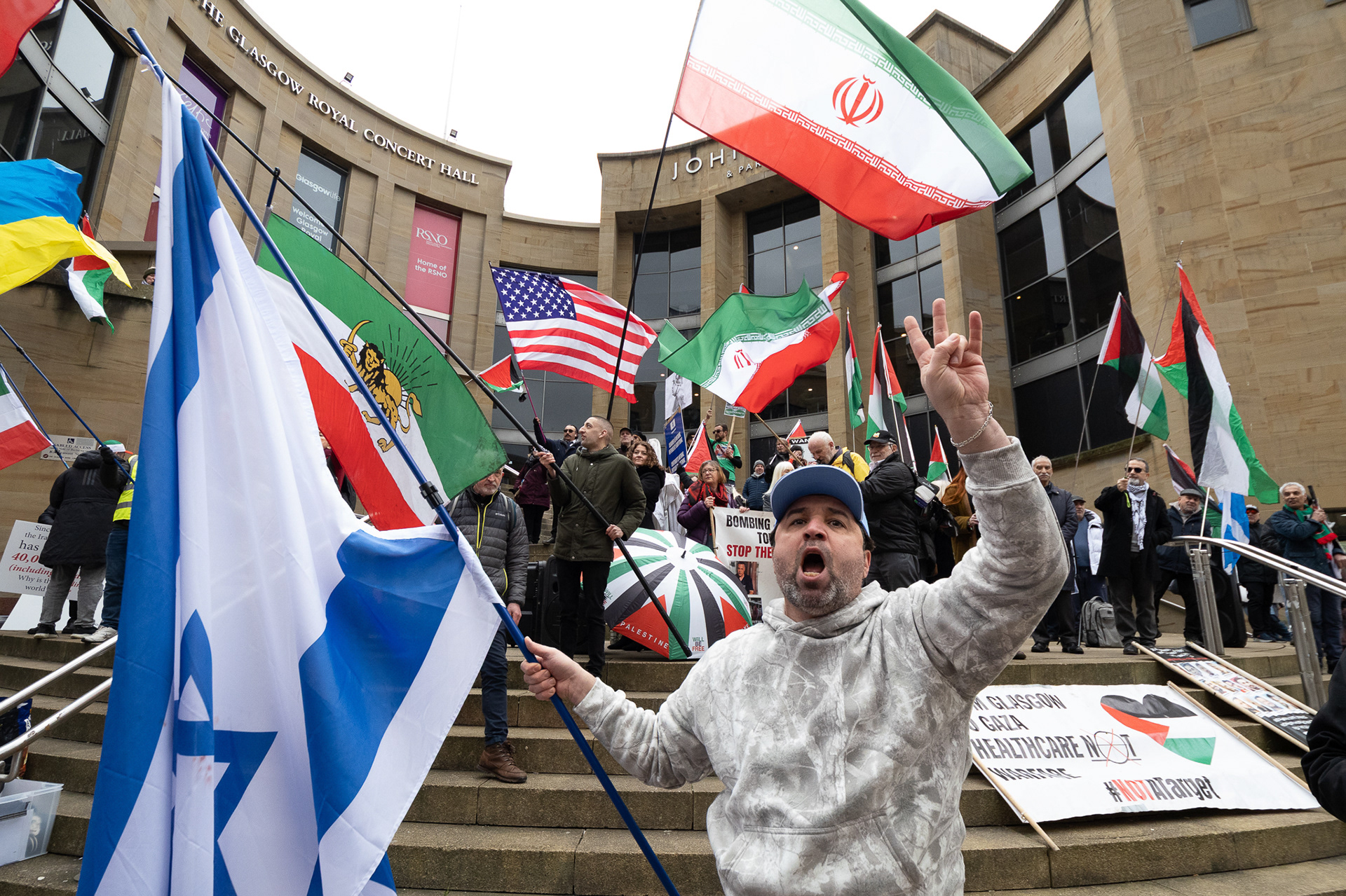 28th Feb 2026 - Members of Scotlands Iranian community, who in recent weeks have been calling for support from the United States and Israel for regime change, held a demonstration in Glasgow as hundreds gathered following news of recent attacks on Iran. The protest was met by a counter-demonstration from pro-Palestinian activists opposing U.S. and Israeli actions.