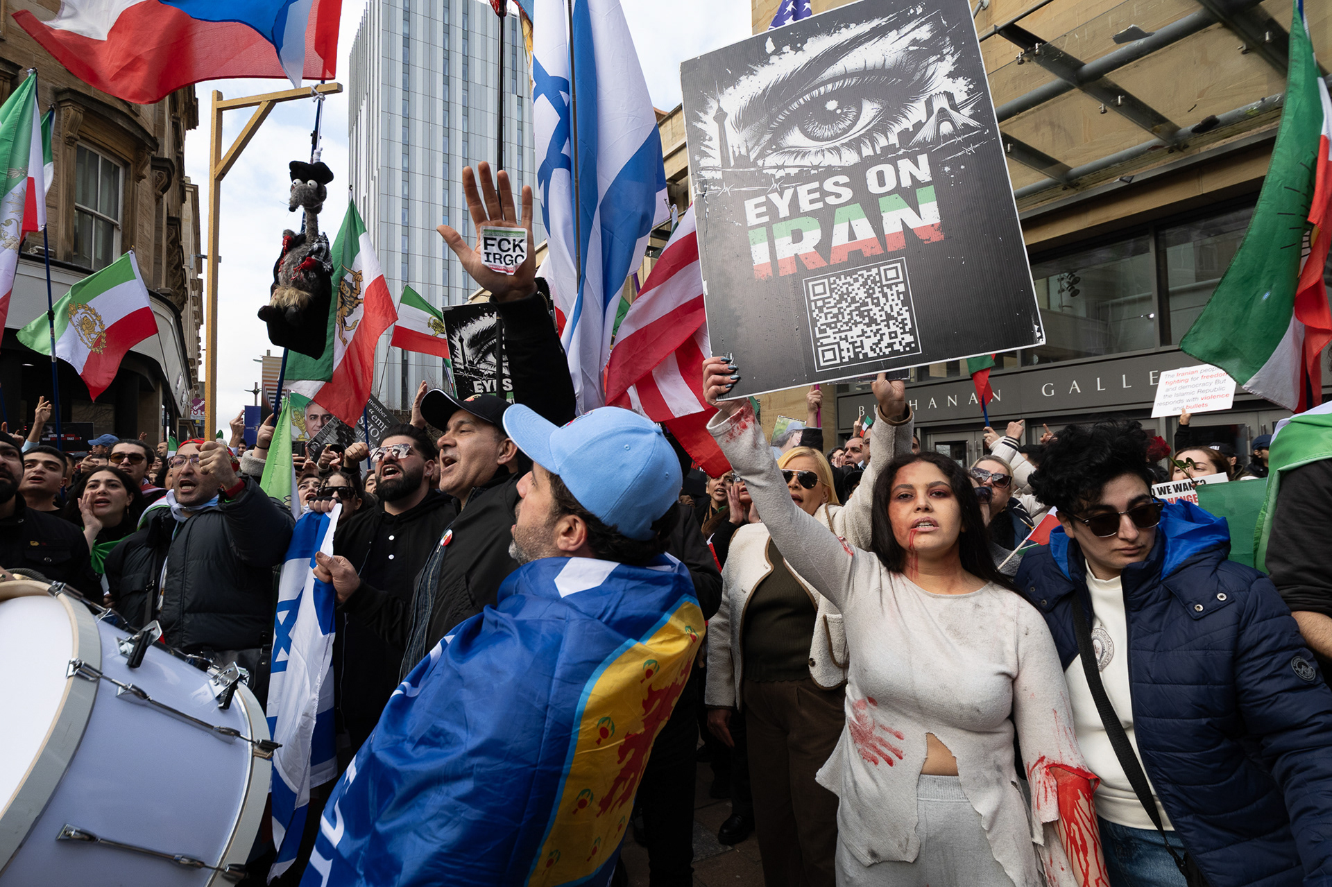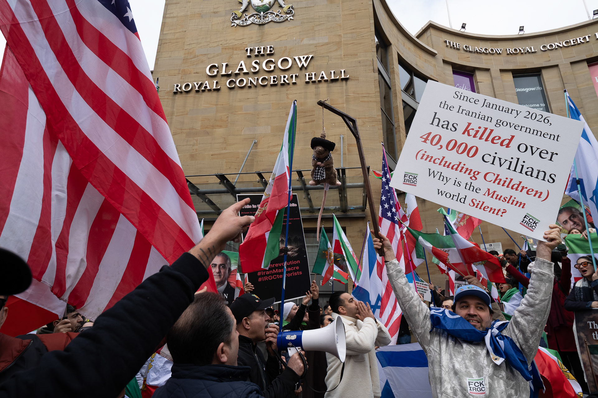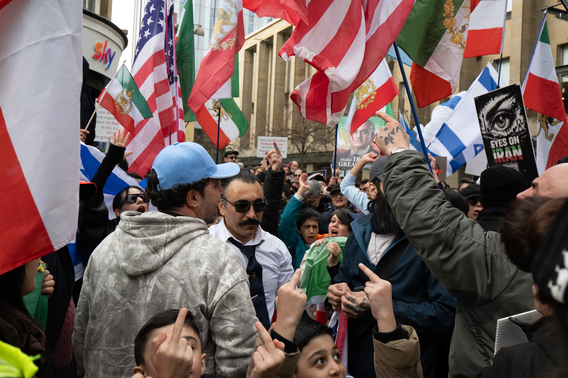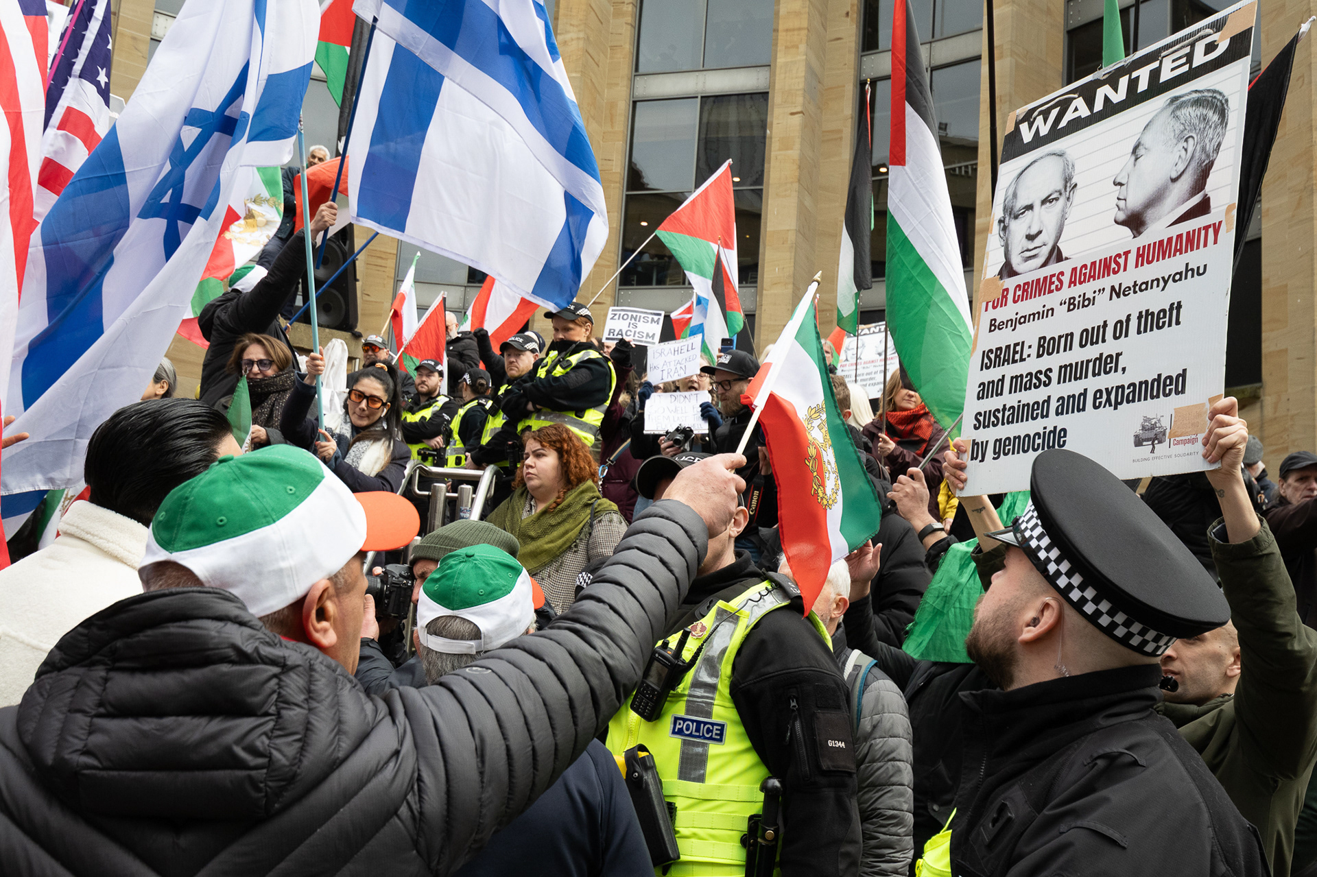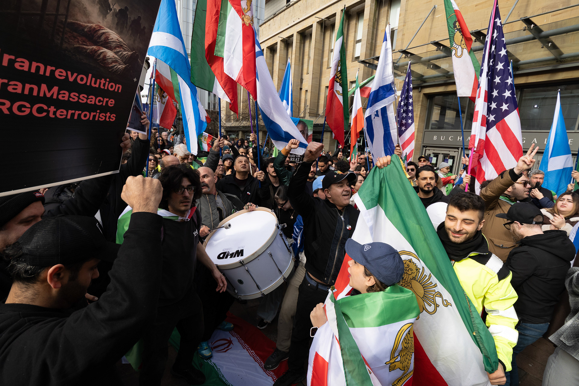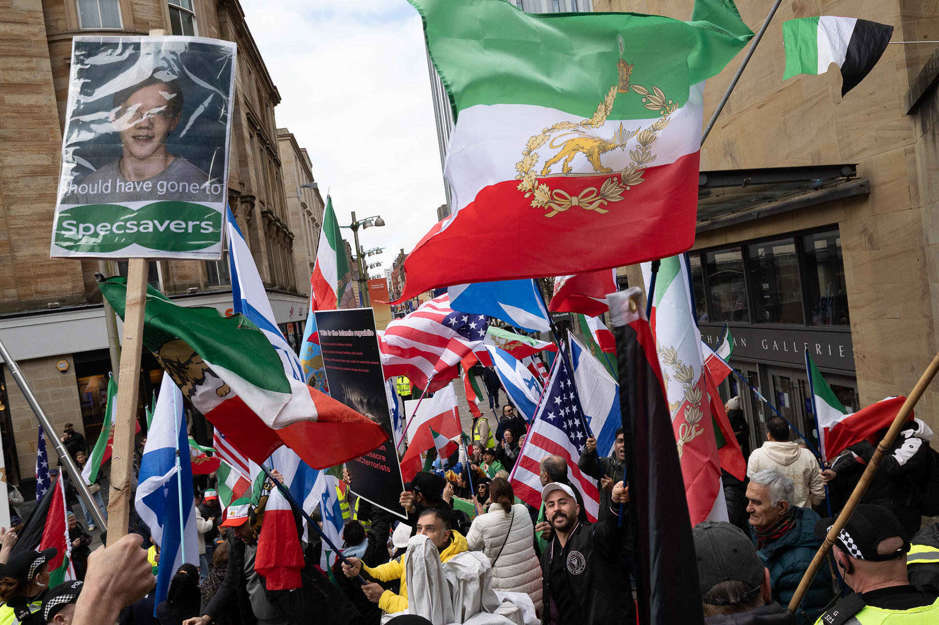28th Feb 2026 - Members of Scotlands Iranian community, who in recent weeks have been calling for support from the United States and Israel for regime change, held a demonstration in Glasgow as hundreds gathered following news of recent attacks on Iran. The protest was met by a counter-demonstration from pro-Palestinian activists opposing U.S. and Israeli actions.