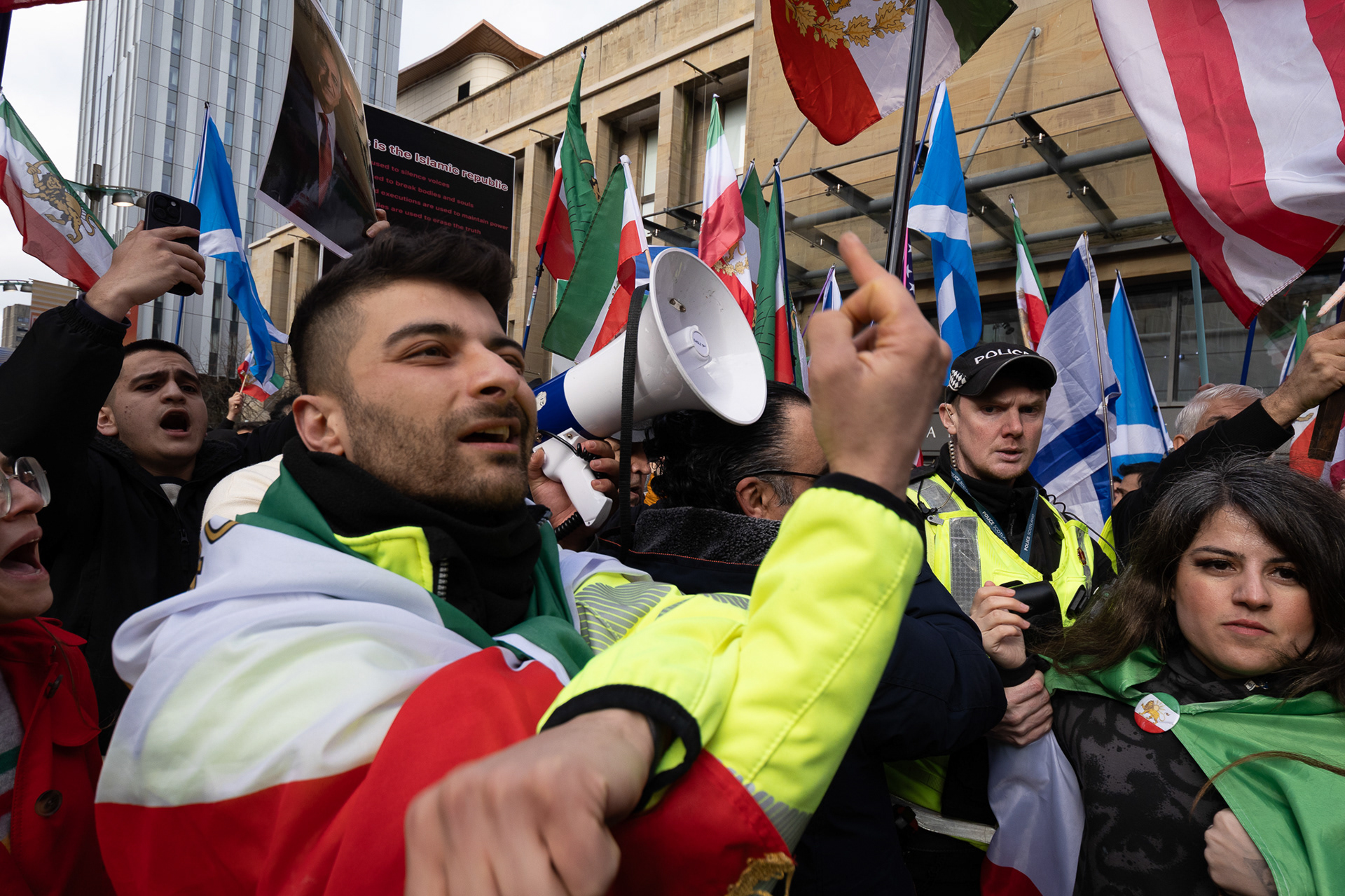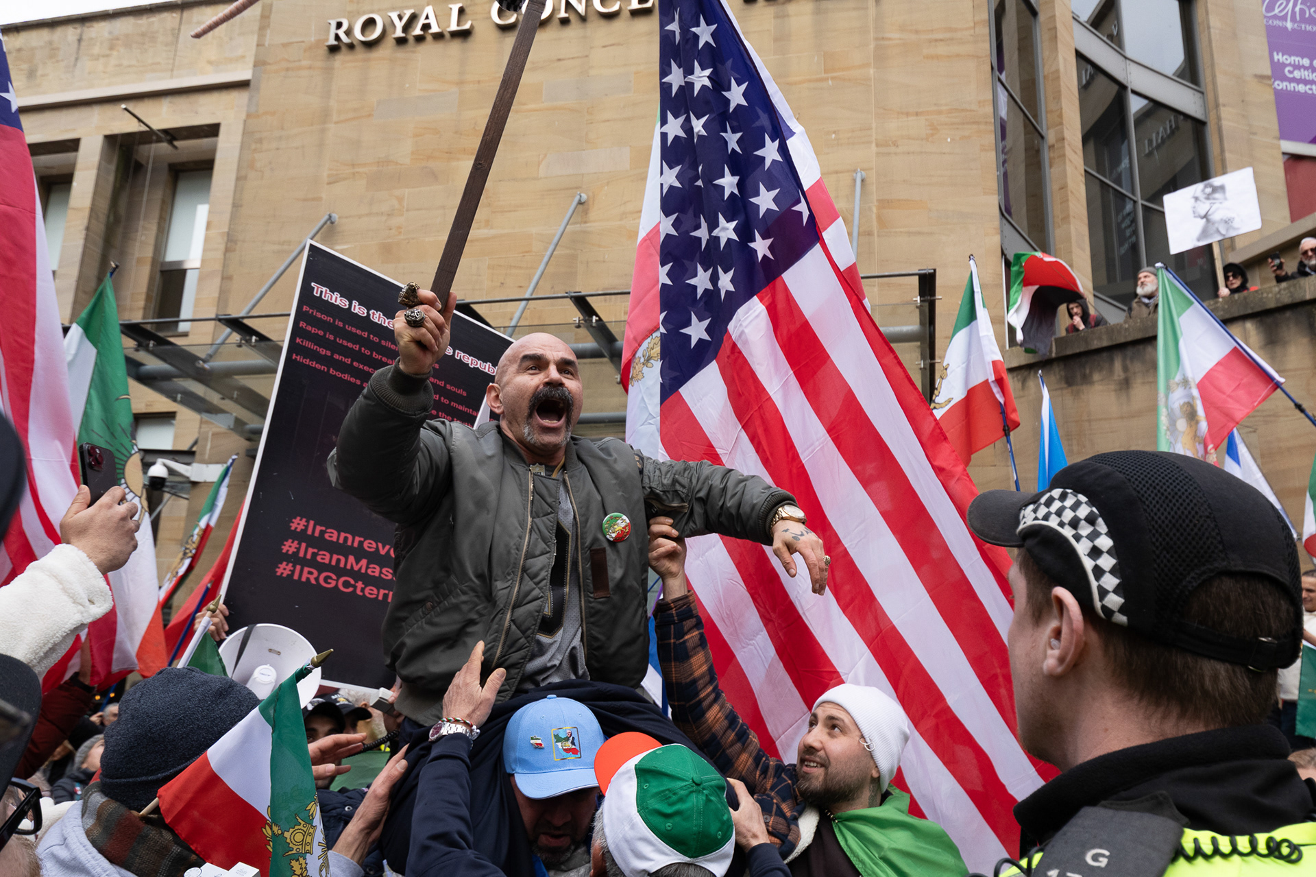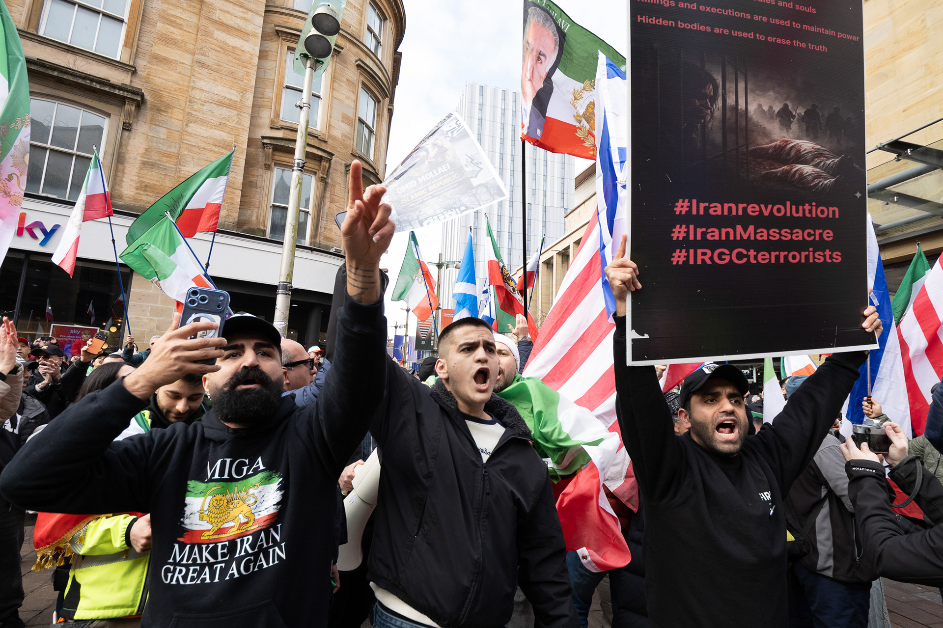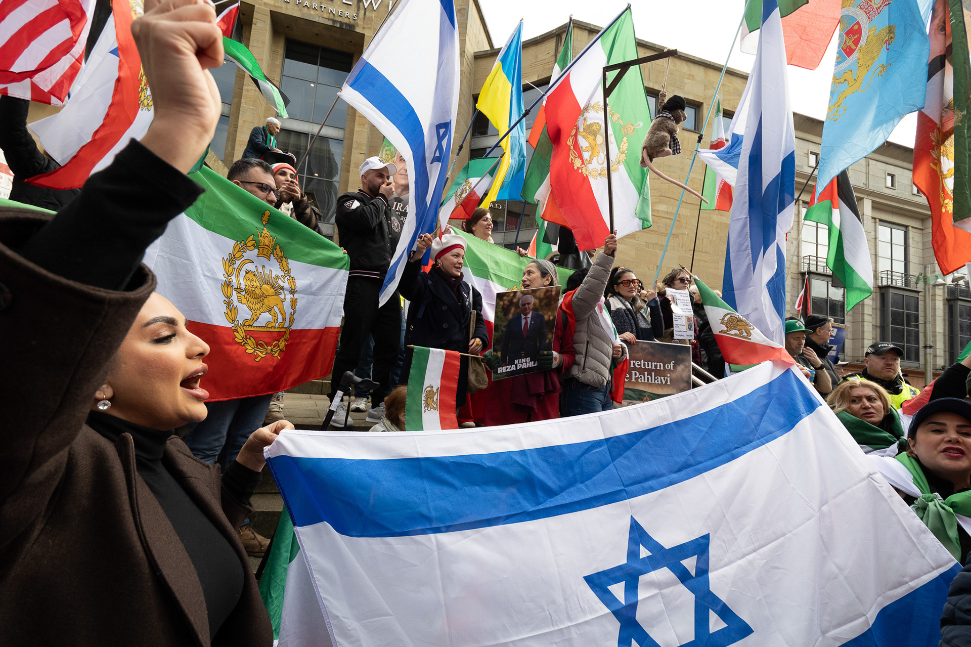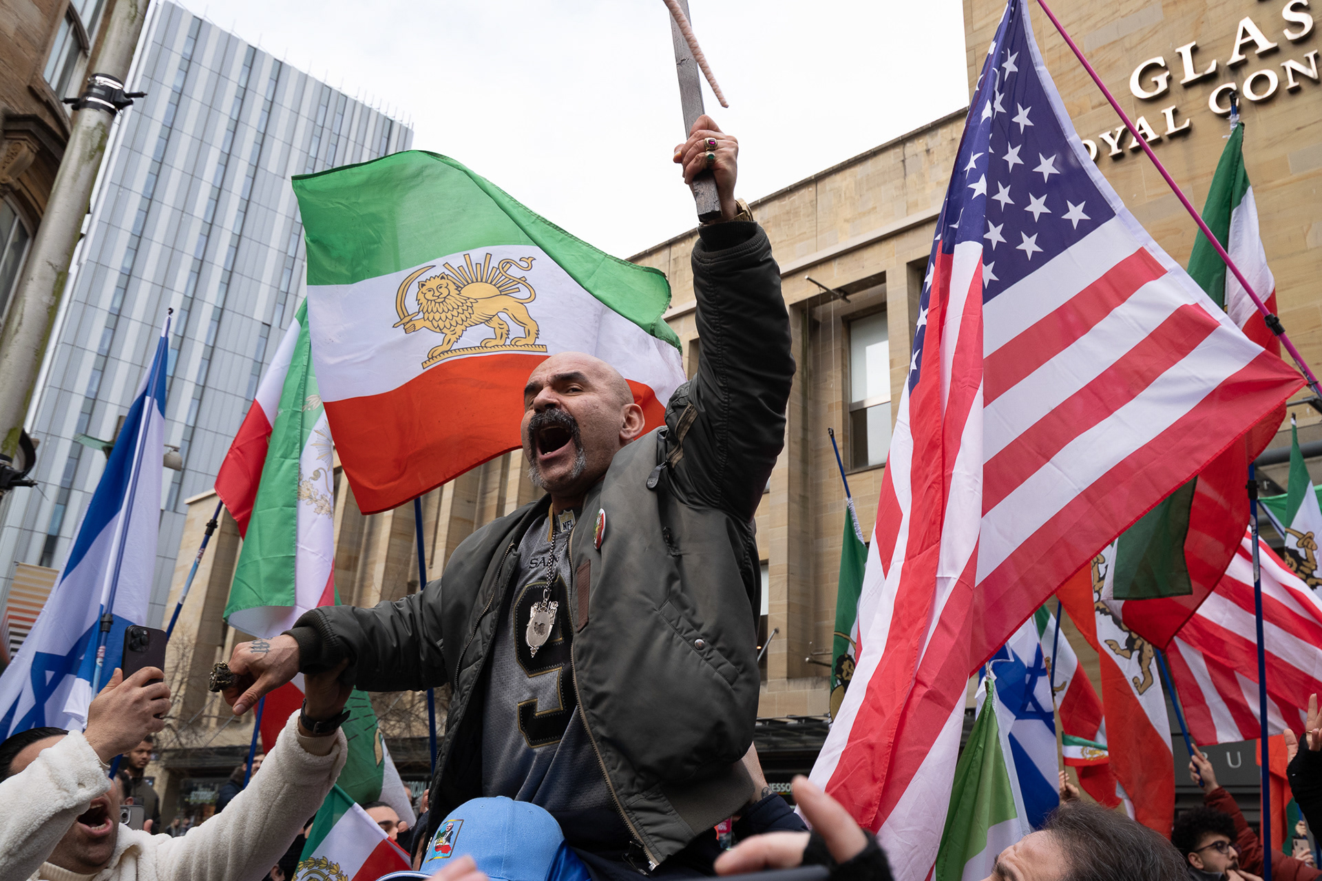28th Feb 2026 - Members of Scotlands Iranian community, who in recent weeks have been calling for support from the United States and Israel for regime change, held a demonstration in Glasgow as hundreds gathered following news of recent attacks on Iran. The protest was met by a counter-demonstration from pro-Palestinian activists opposing U.S. and Israeli actions.