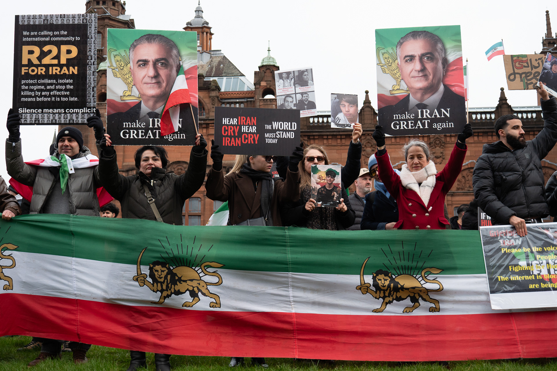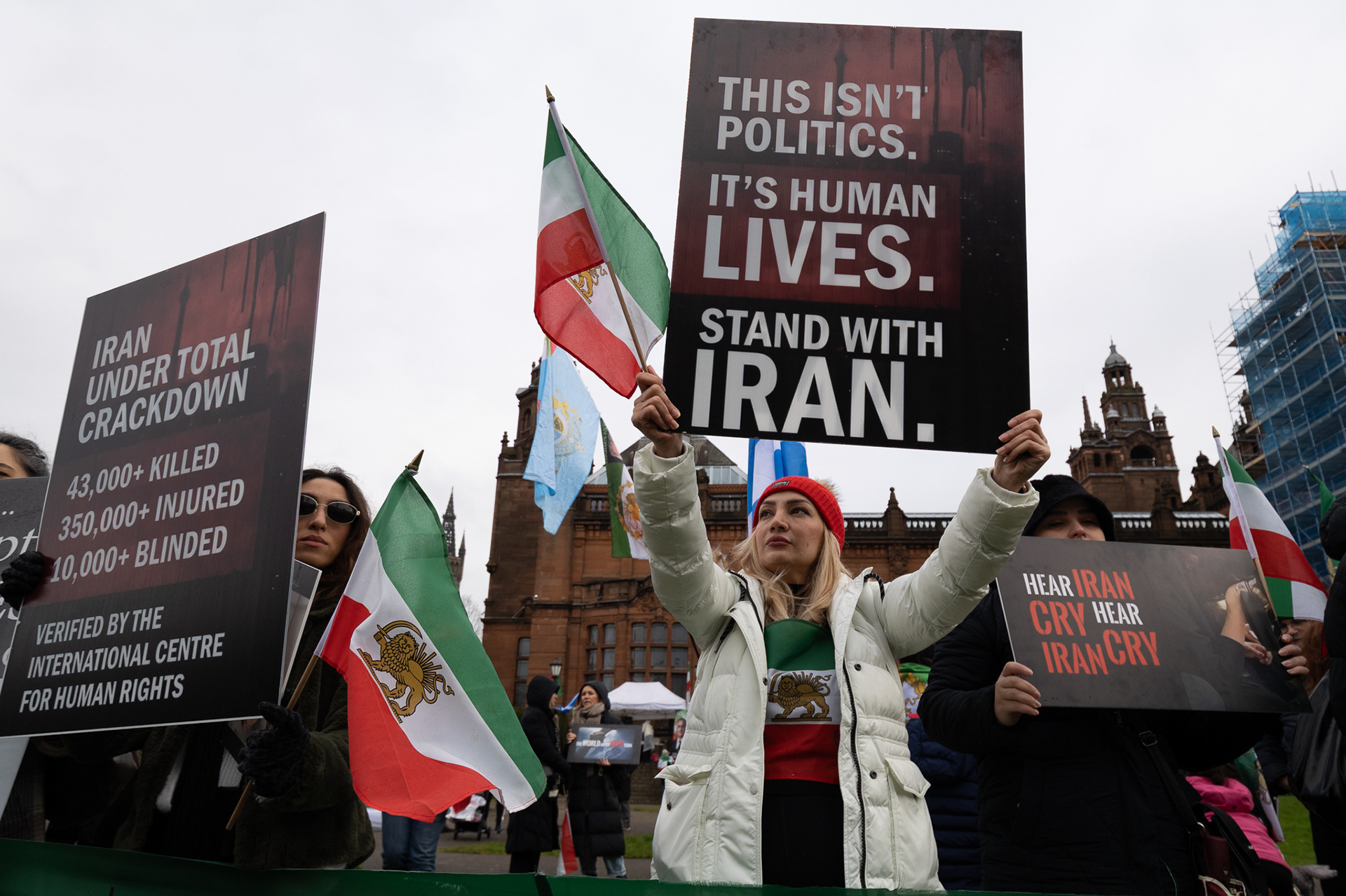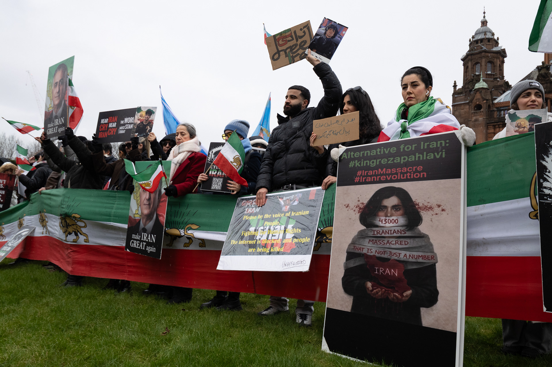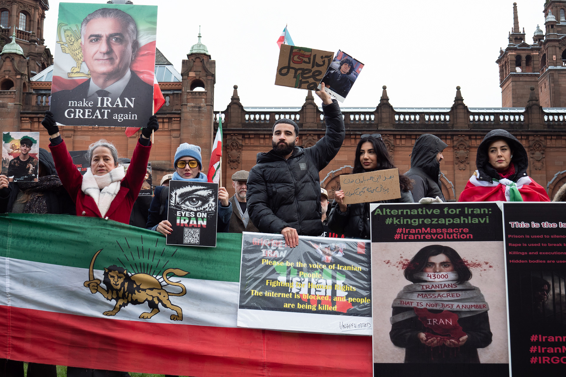31st January 2026 - Activists and members of Scotland's Iranian community held a demonstration in Glasgow in support of protesters in Iran. Hundreds gathered outside the Kelvingrove Art Gallery, calling for recognition of the right to peaceful protest and international backing for a democratic transition.