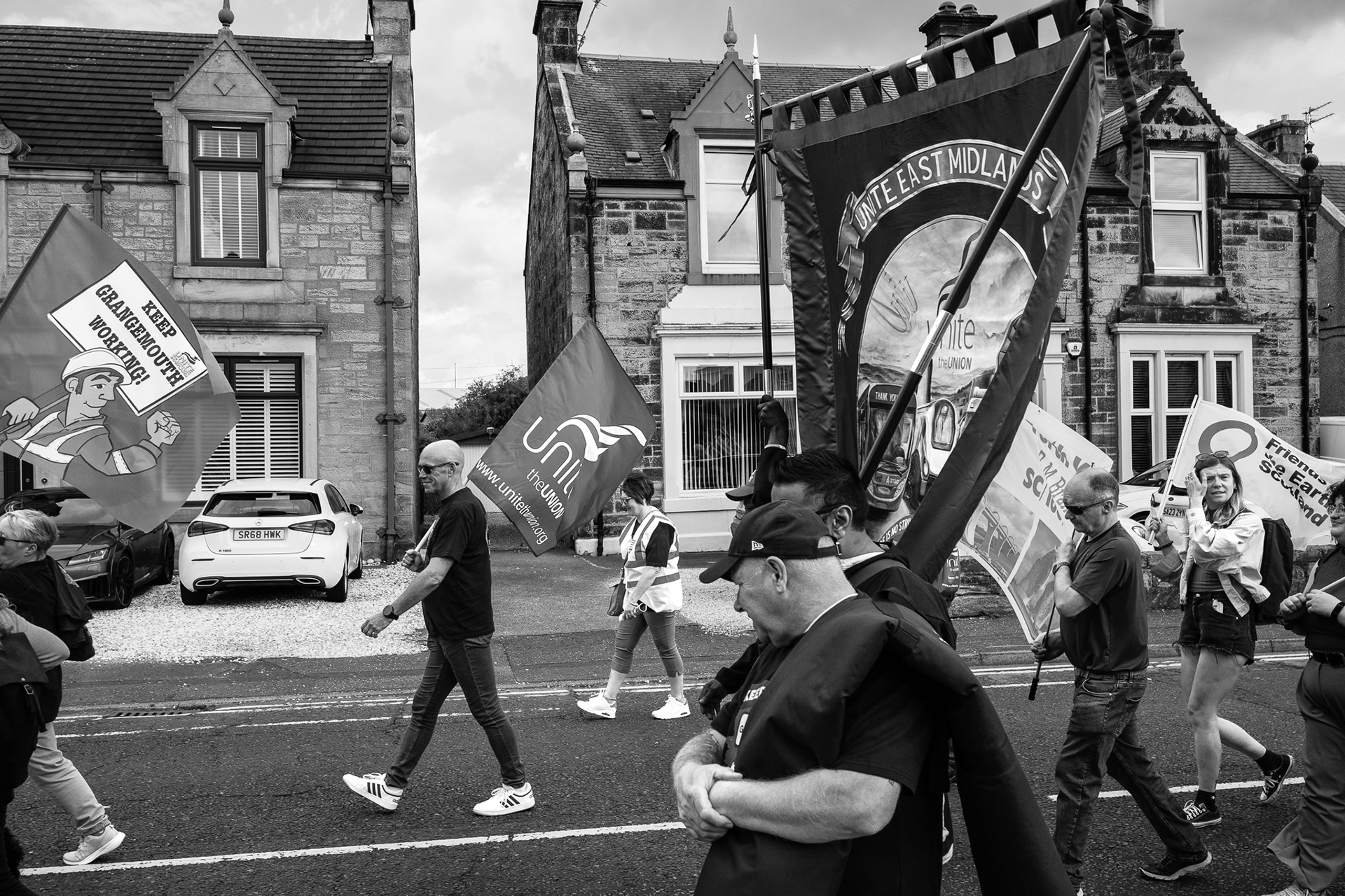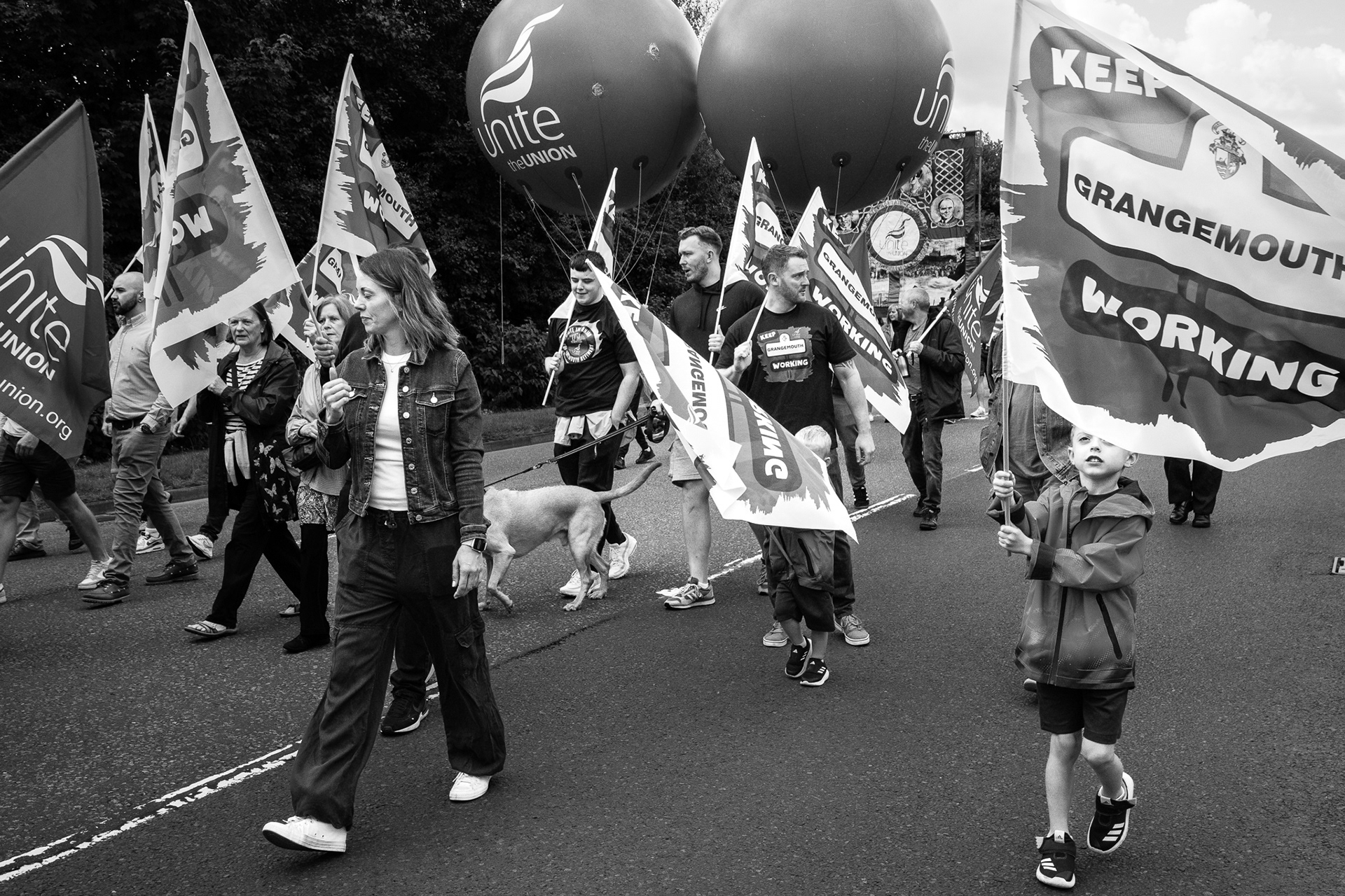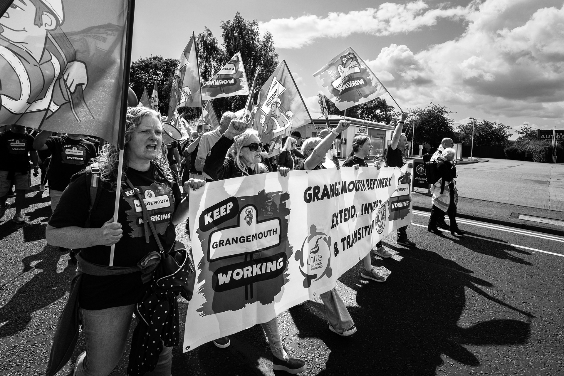 3rd August 2024 - The Keep Grangemouth Working campaign group held a protest that was supported by workers, community members and trade unionists who marched in support of five hundred refinery workers and the thousands more dependent upon it that would be lost if proposed plans to close Scotland's only oil refinery went ahead. This came on the back of an announcement by the refinery owners, Petroineos, to transition the refinery operations to an import and export oil terminal facility.